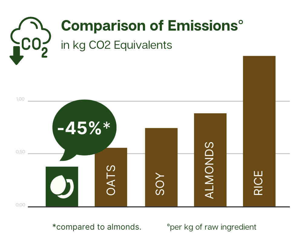 Unser Rohstoff wird nicht extra angebaut und trägt daher den geringsten CO2-, Wasser- und Landverbrauch der Nusswelt (vgl. Hafer, Soja, Mandeln, Reis).